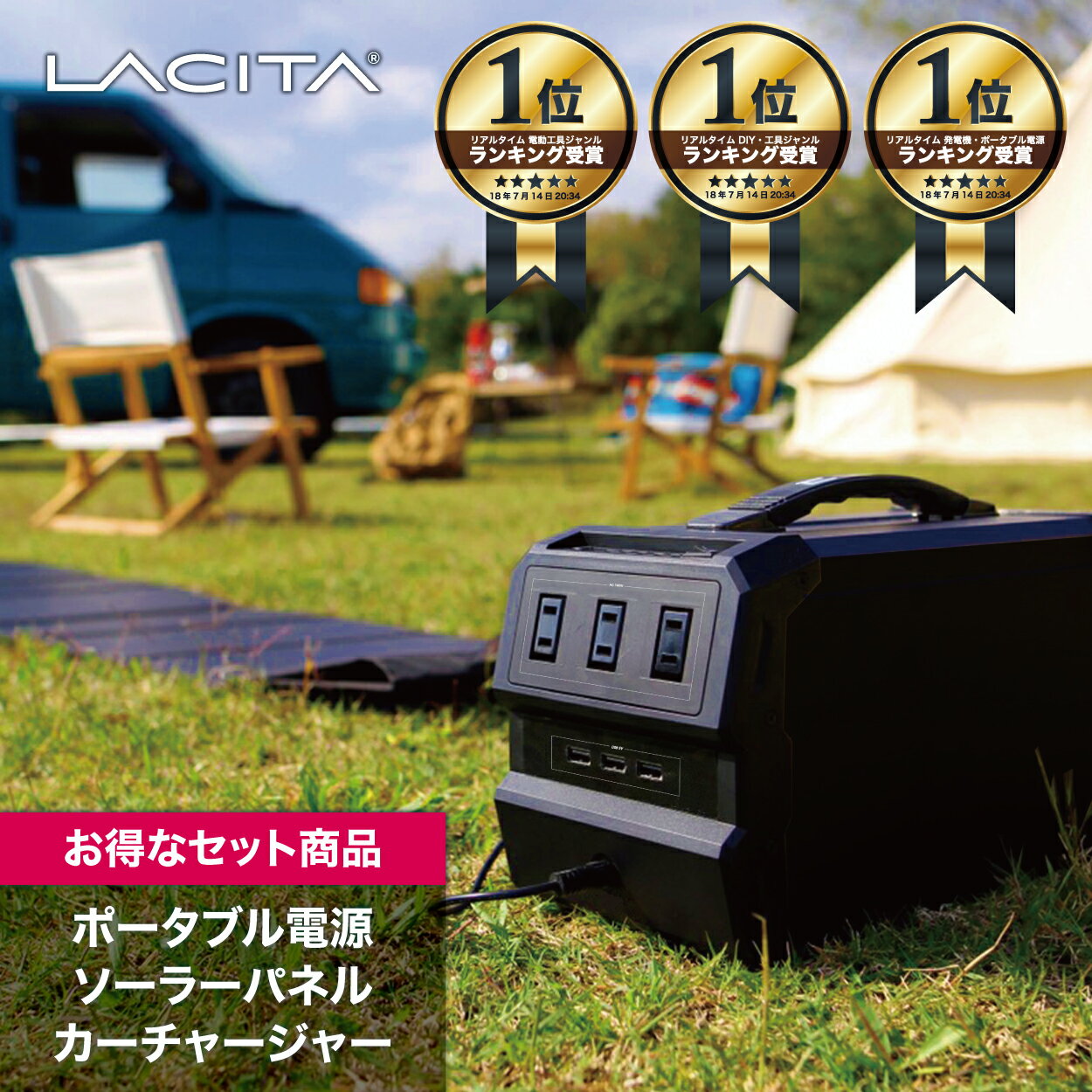 LACITA ポータブル電源 大容量 カーチャージャー セット 車中泊 正弦波 エナーボックス 444Wh 120000mAh 400W | ポータブルバッテリー バッテリー 蓄電器 AC電源 発電機 小型 蓄電池 家庭用 ソーラー 電気毛布