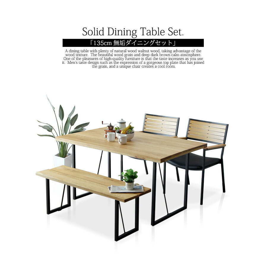商品情報 材質 ■テーブル・ベンチ ウォールナット/オーク無垢 ラバーウッド無垢(木脚) スチール(鉄脚) オイル塗装 ■チェア 突板/天然木 スチール/PVC ウレタン塗装 サイズ ■テーブル ・幅135 奥行80 高さ70cm ■チェア ・幅57 奥行57 高さ81/SH44cm ■ベンチ ・幅115 奥行36 高さ41.5cm カラー ・ブラウン(ウォールナット)/ナチュラル(オーク) 特徴 ・テーブルとベンチは簡易組立(脚取付け) チェアは完成品です。